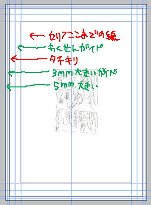 仕上がり線、3mm大きい線、5mm大きい線のガイドを引いておいたらどの印刷所にも対応できると思って…